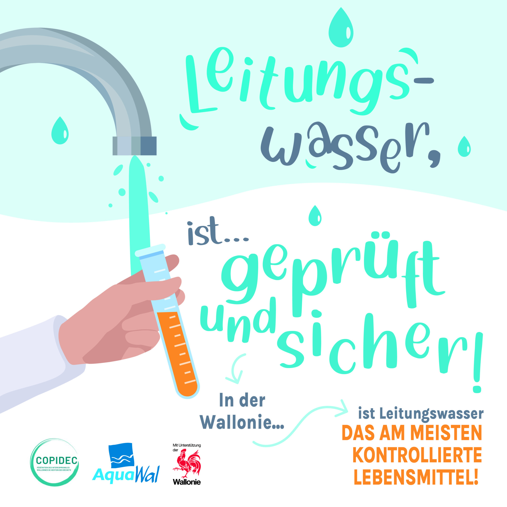Leitungswasser ist das am meisten kontrollierte Lebensmittelprodukt in Belgien. 420 Kontrollen der Wasserqualität werden durchschnittlich jede Woche durch AQUAWAL (der Berufsverband der öffentlichen Betreiber des Wasserkreislaufs in der Wallonie) durchgeführt. Das Leitungswasser stammt zu 75 % aus Grundwasser (Grundwasservorkommen) und zu 25 % aus Oberflächenwasser (Flüsse und Talsperren). Auf seinem gesamten Weg wird das Wasser einer sehr strengen Behandlung unterzogen. Um eine Verunreinigung auf dem Transportweg des Wassers zu verhindern, werden ihm schließlich manchmal Chlorverbindungen zugesetzt.